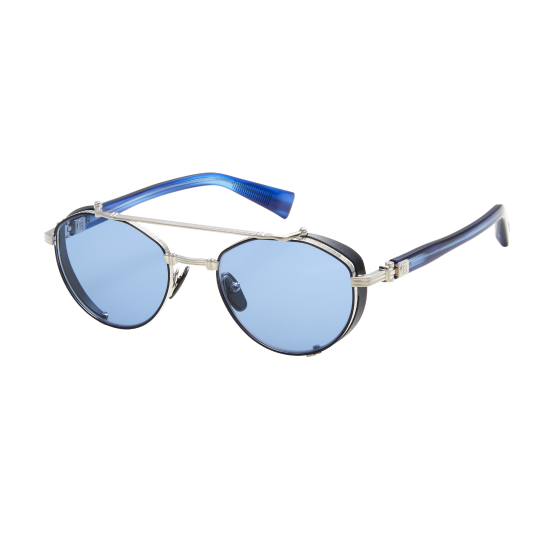 Occhiale Balmain in titanio giapponese argento con lenti blu.