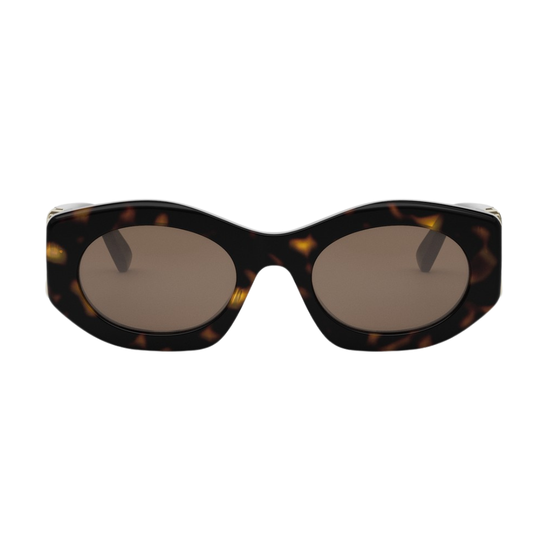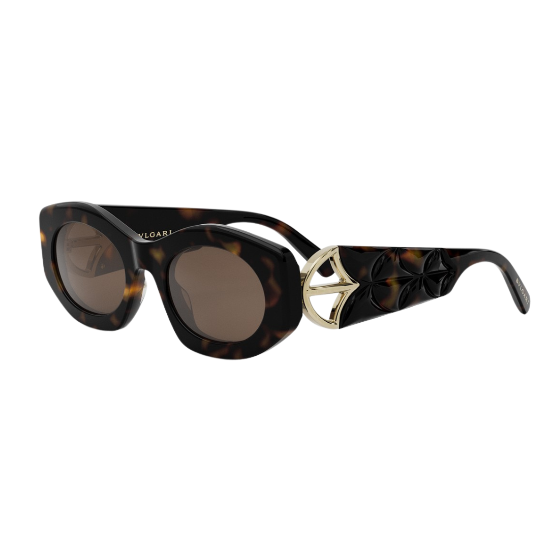 Occhiale Bvlgari in acetato havana .Logo in metallo con base laccata all’esterno dei terminali. Lente marrone
