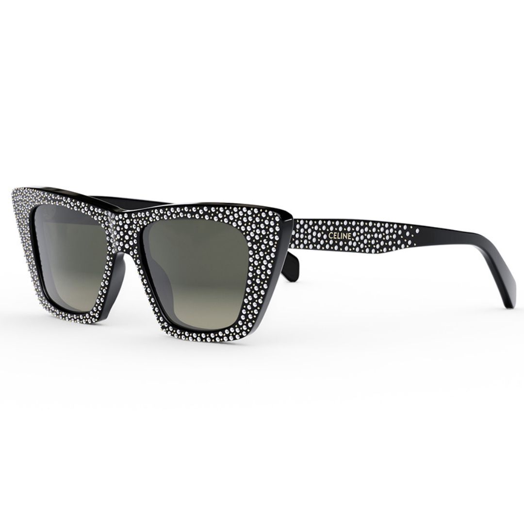 Scegli il tuo stile Cรฉline e scopri il modello CL4187IS modello gatto, montatura in acetato nero tempestata di swarosky argento. ponte a sella. lenti grigie sfumate.
