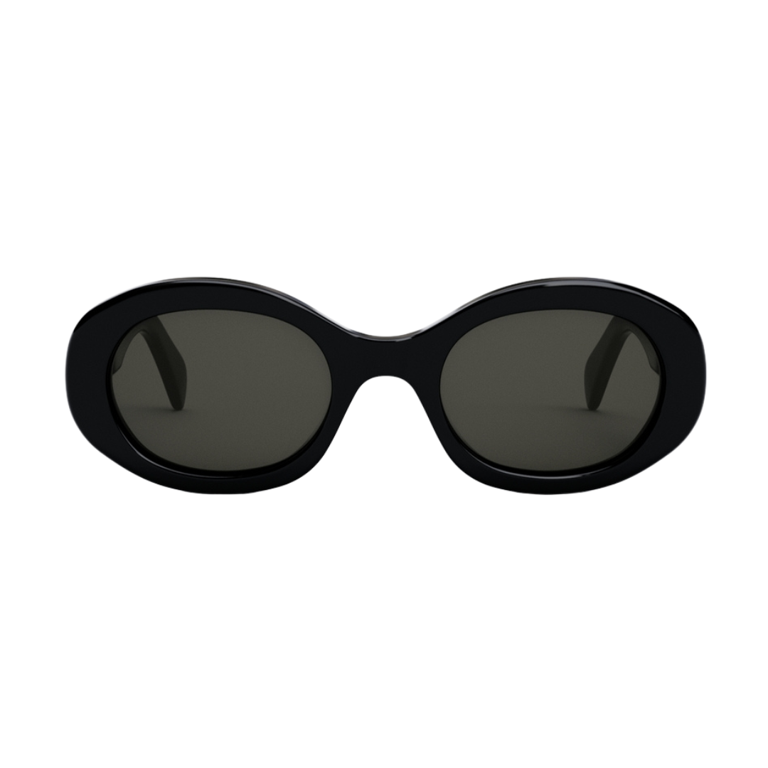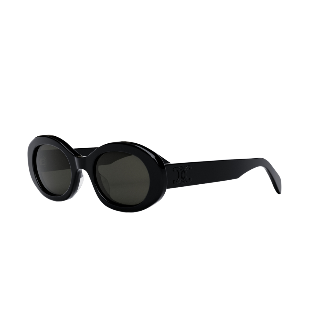 Occhiale da sole Celine in acetato nero con logo sulle aste dello stesso colore . Lenti grigio organico