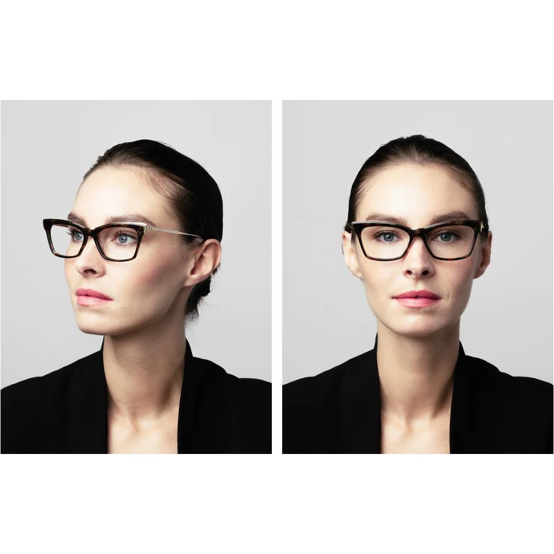 LA SOFISTICATA MONTATURA FRONTALE IN ACETATO DI Nemora presenta una cresta continua in titanio che attraversa la linea delle sopracciglia, accentuando la sua modifica forma a occhio di gatto.