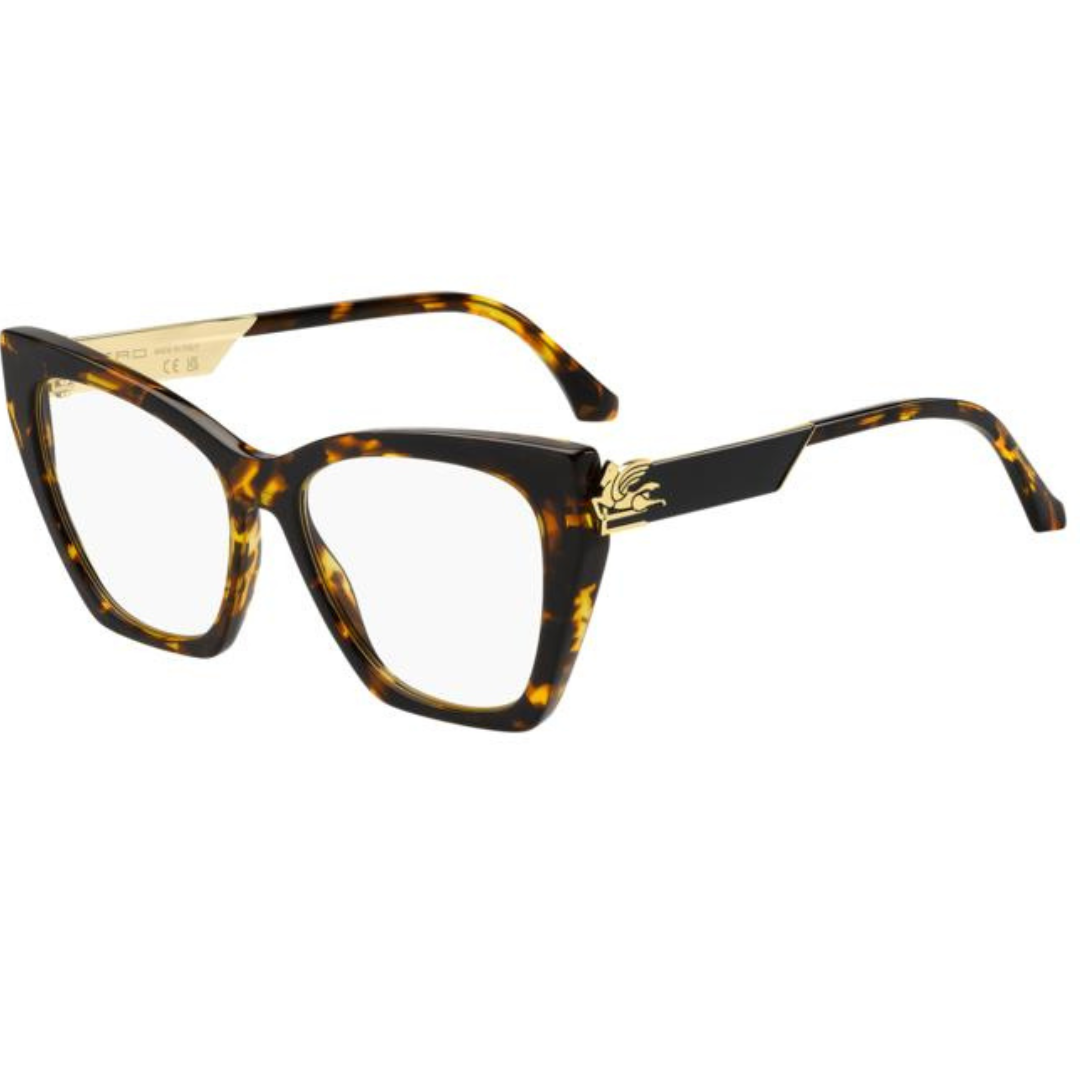 Occhiale Etro in acetato smussato e aste in metallo decorate con la fantasia floreale di Etro.