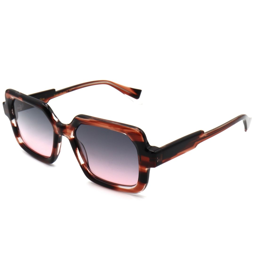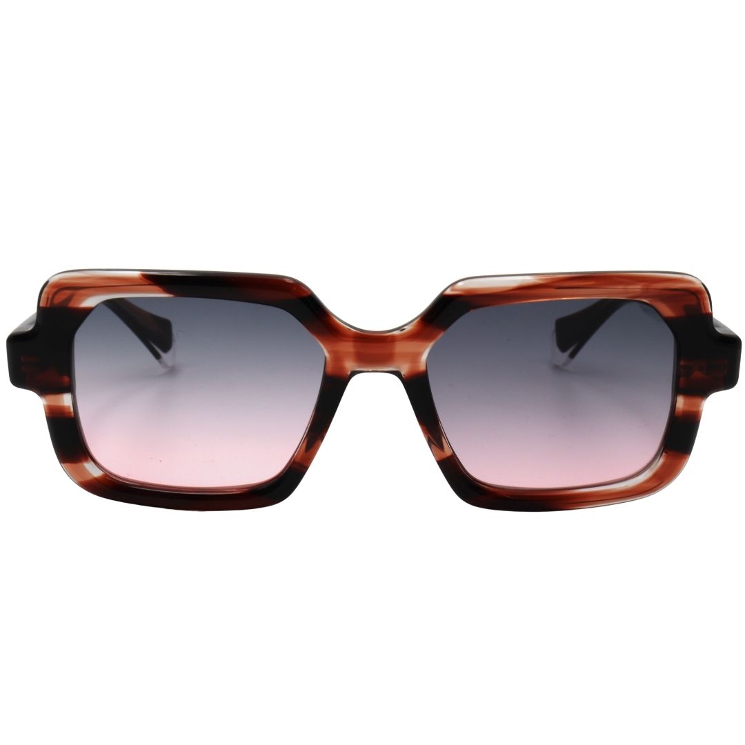 Presentiamo ALEXIA, un design dalla forma rettangolare realizzato in acetato che combina contorni sottili con altri piรน grossi. Lenti CR39 con massima protezione UVA e UVB e trattamento antiriflesso che garantiscono un grande comfort visivo. Modello in acetato tartarugato con lentiย blu sfumate rosa