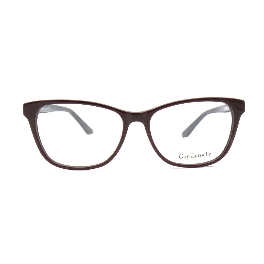 Una reinterpretazione del classico, una ricerca di eleganza e semplicitร , in linea con la maison di modaย Guy Laroche di Parigi. Un autentico manifesto contro il caos e lโeccesso presente nel mondo del fashion e dellโhaute-couture. I suoi occhiali rappresentano il contemporaneo elegante e sofisticato. Questo modello si presenta in acetato bordeaux sul frontale e aste in acetato nero con dettaglio strass e lenti trasparenti