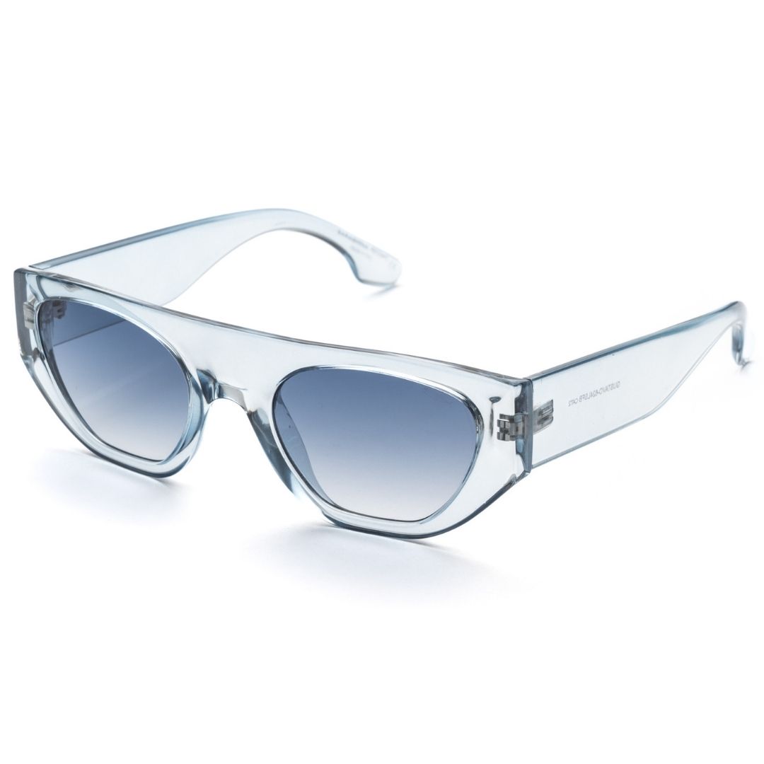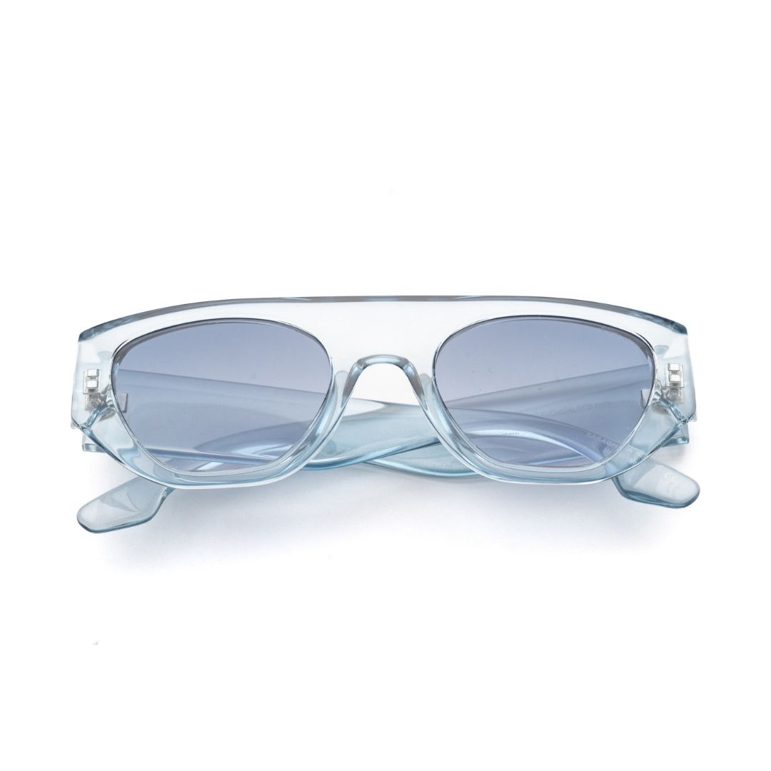 Occhiale da sole Saraghina modello Gustavo si presenta in una montatura di nylon azzurro cristallo lucido con delle lenti grigie. Progettato e realizzato in Italia, da artigiani specializzati che utilizzano esclusivamente materiali e componenti di prima qualitร .