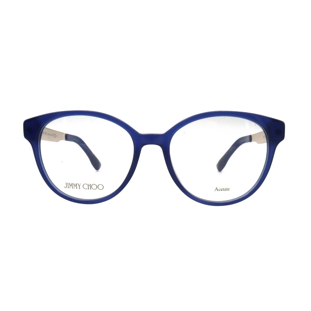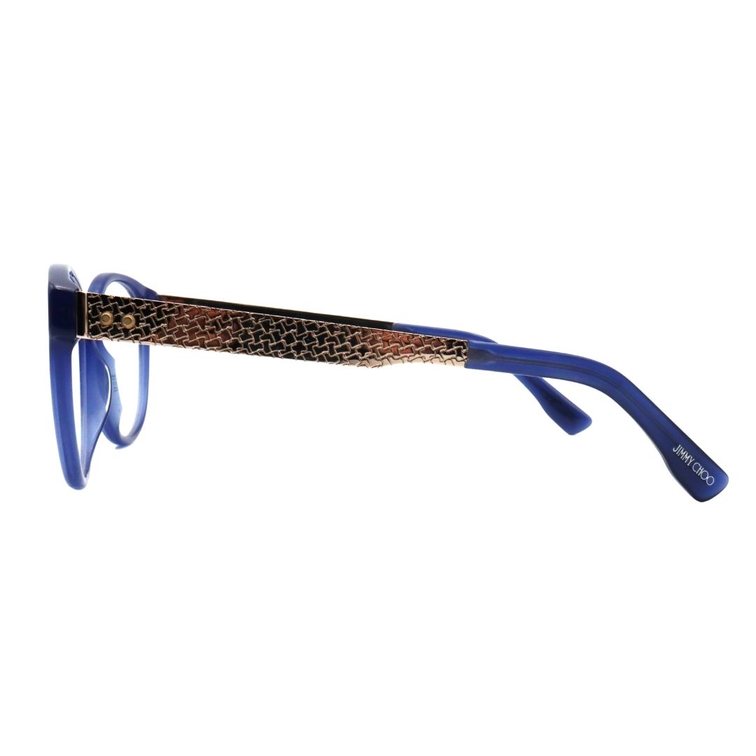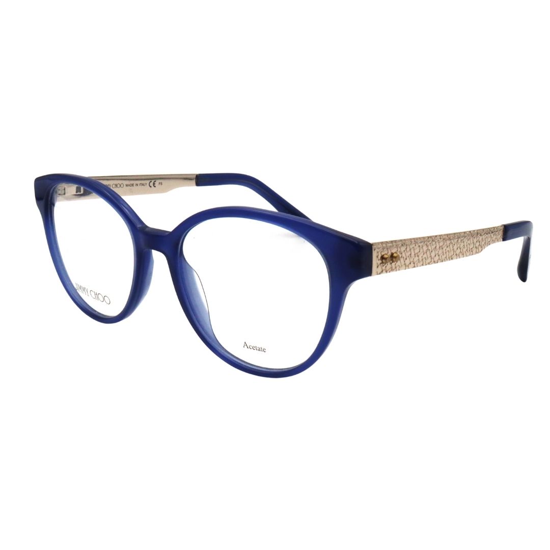 Gli occhiali Jimmy Choo sono gli occhialiย sempre al passo con la moda. Comodi, raffinati e avanguardisti del fashion di oggi ti accompagnano in ogni momento della giornata. Questo modello si presenta con una forma tonda in acetato blu con aste in metallo color oro lavorato e lenti trasparenti.