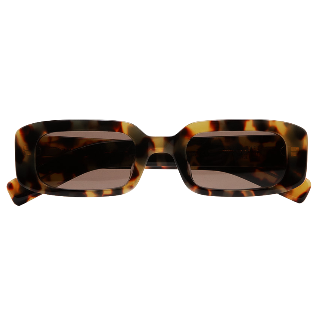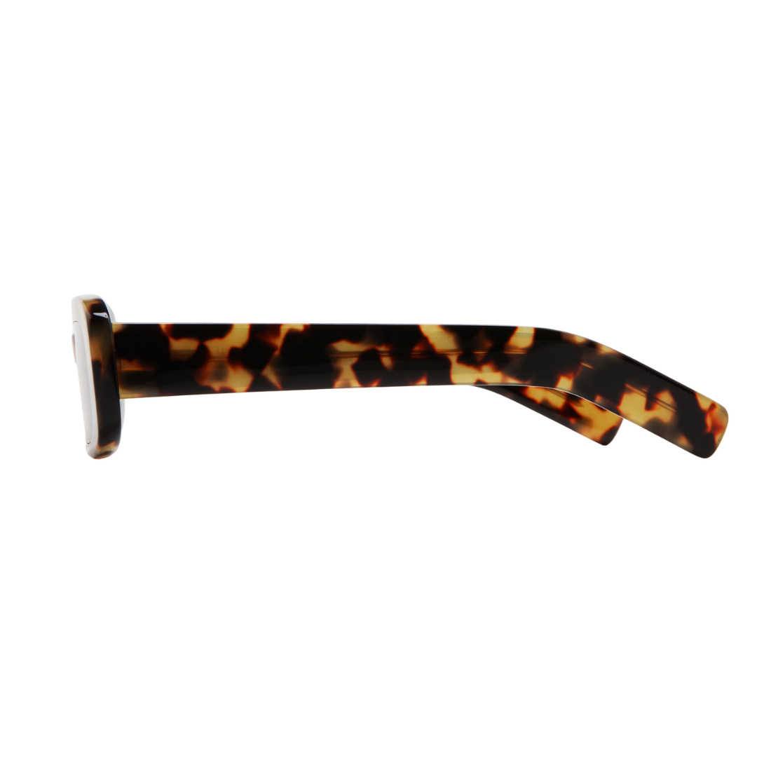 Occhiali da sole rettangolari. Frontale e aste in acetato havana marrone. Lente grigia base 2 con protezione UV al 100% e trattamento antiriflesso