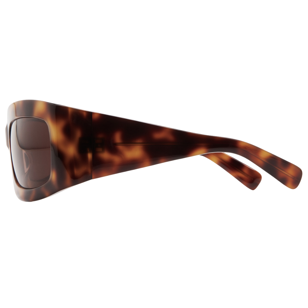 Occhiali avvolgenti rettangolari. Frontale e aste in acetato havana marrone. Lente marrone base 8 con protezione UV al 100% e trattamento antiriflesso. Lente di categoria 3. Piastrine in acetato integrate. Realizzati a mano.