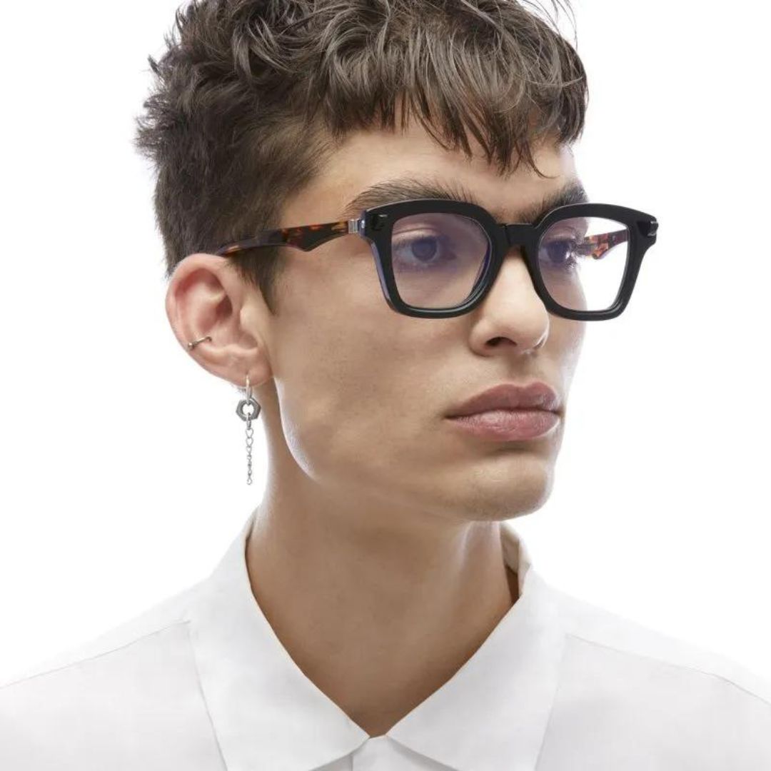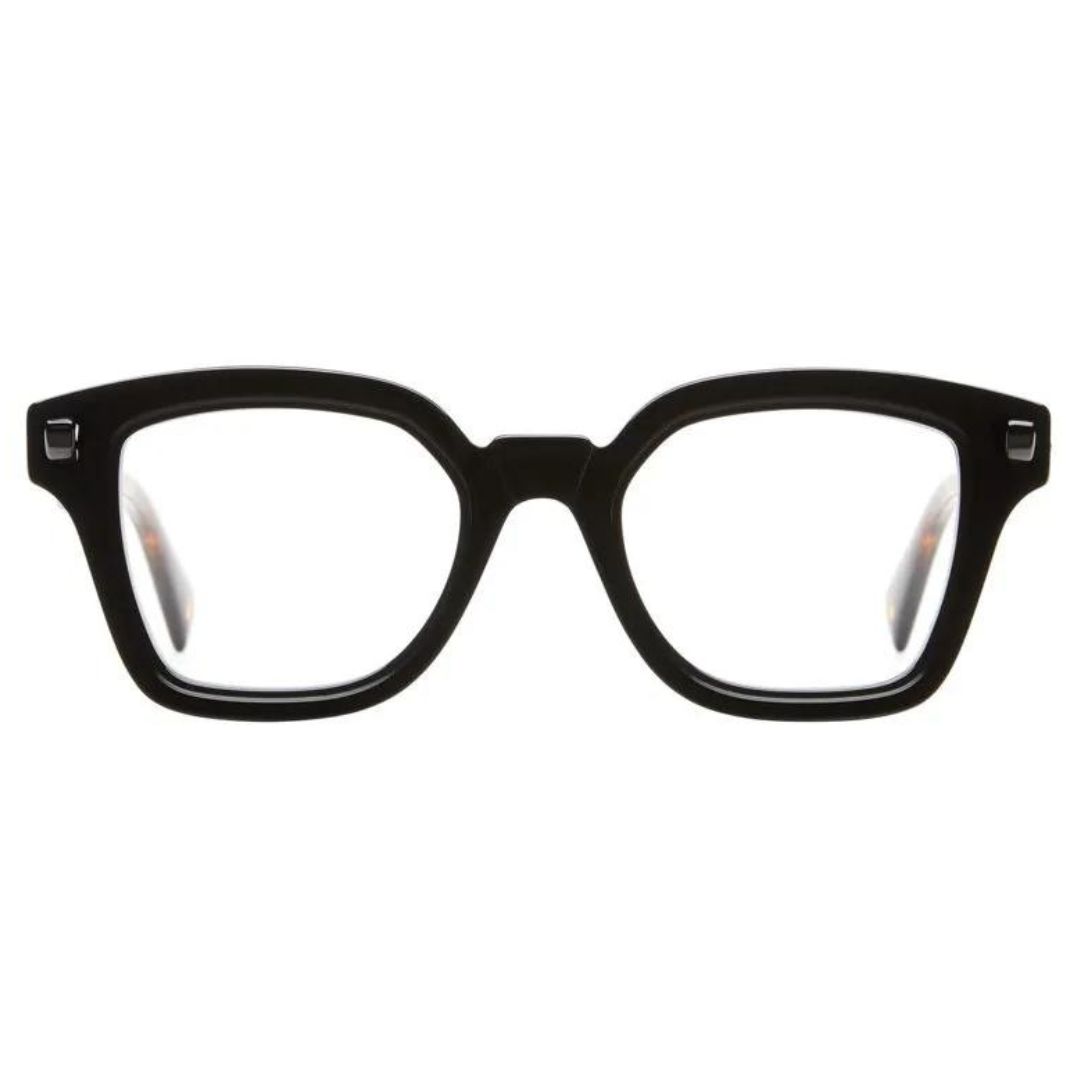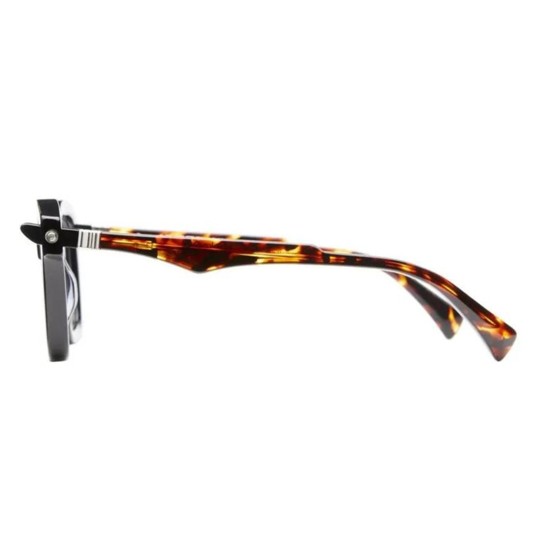 Montatura squadrata in doppio acetato nero e tartarugato con lenti trasparenti