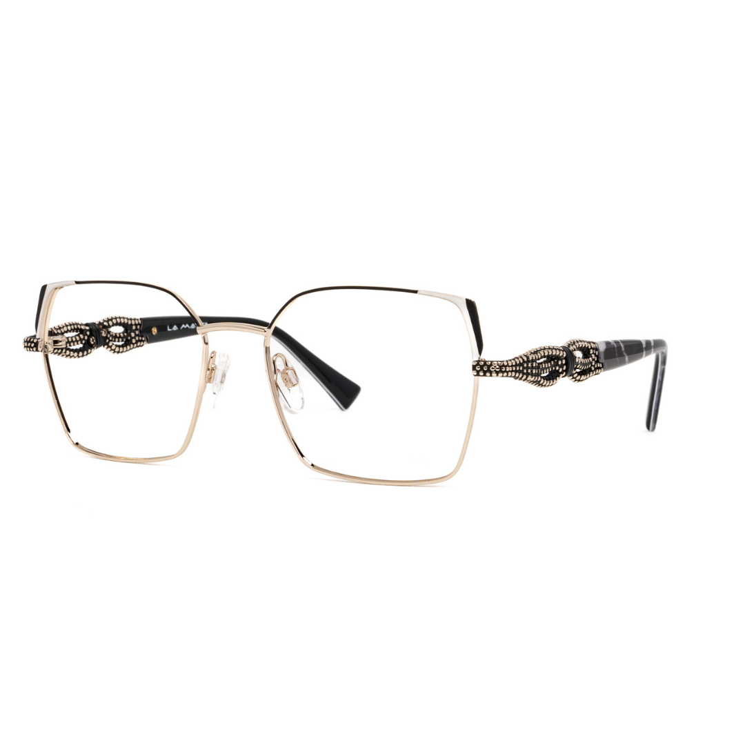 Occhiale La matta in metallo e acetato, presenta particolari aste lavorate ad intreccio.