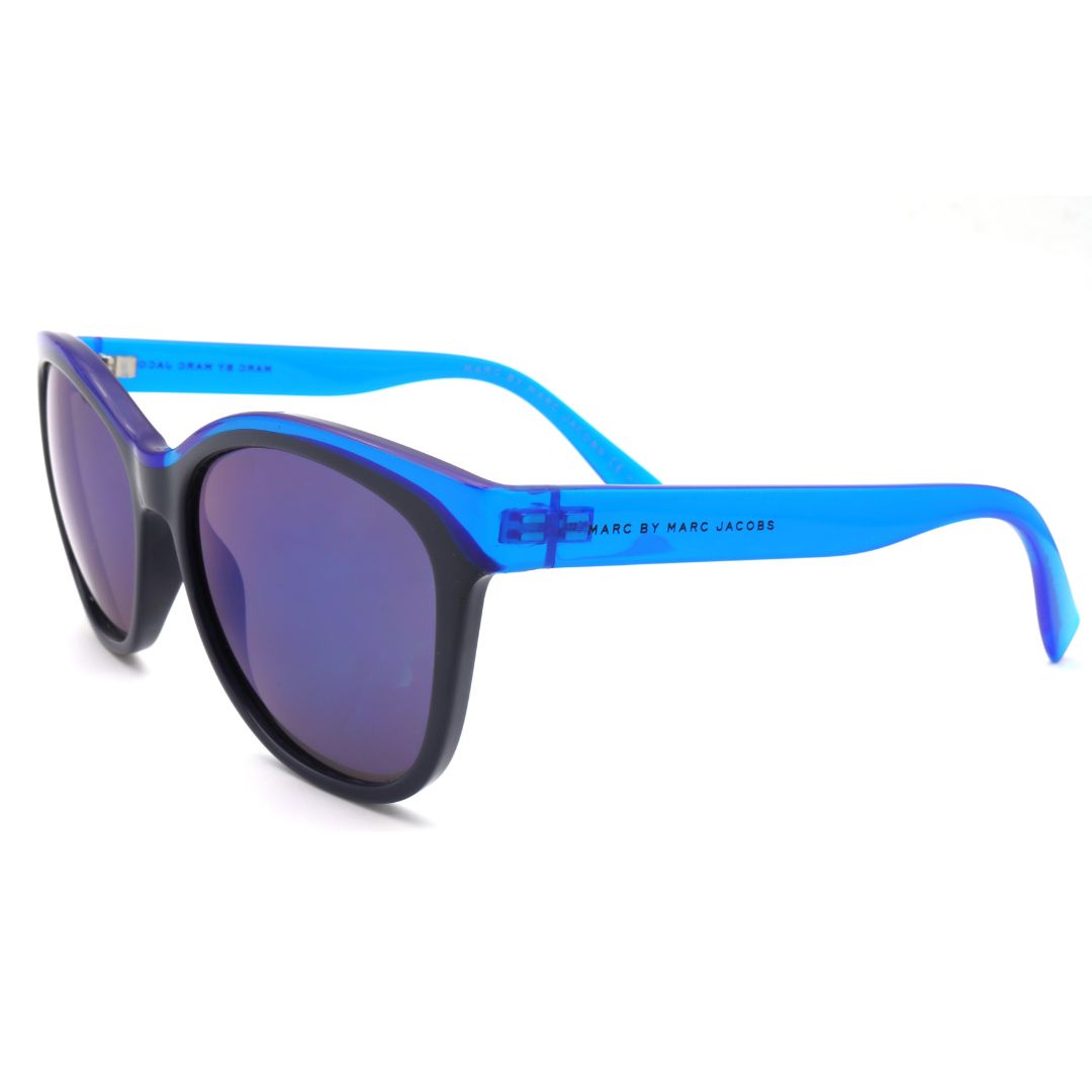 Occhiale da sole Marc Jacobs modello disponibile in acetato bicolore nero e blu con lenti abbinate grigie flash blu