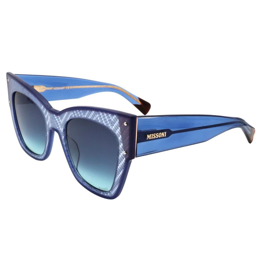 La collezione eyewear Missoni Fabric รจ caratterizzata da silhouette dal carattere audace e contemporaneo, arricchite con inserti in tessuti iconici Missoni. La costruzione presenta dettagli iper sofisticati, come bordi a contrasto, aste ampie e una palette di colori intensi. Le esclusive cerniere a zig zag e le borchie doppie sono dettagli inconfondibili del brand. Questo modello si presenta nella colorazione azzurro con inserto in tessuto interno nel frontale
