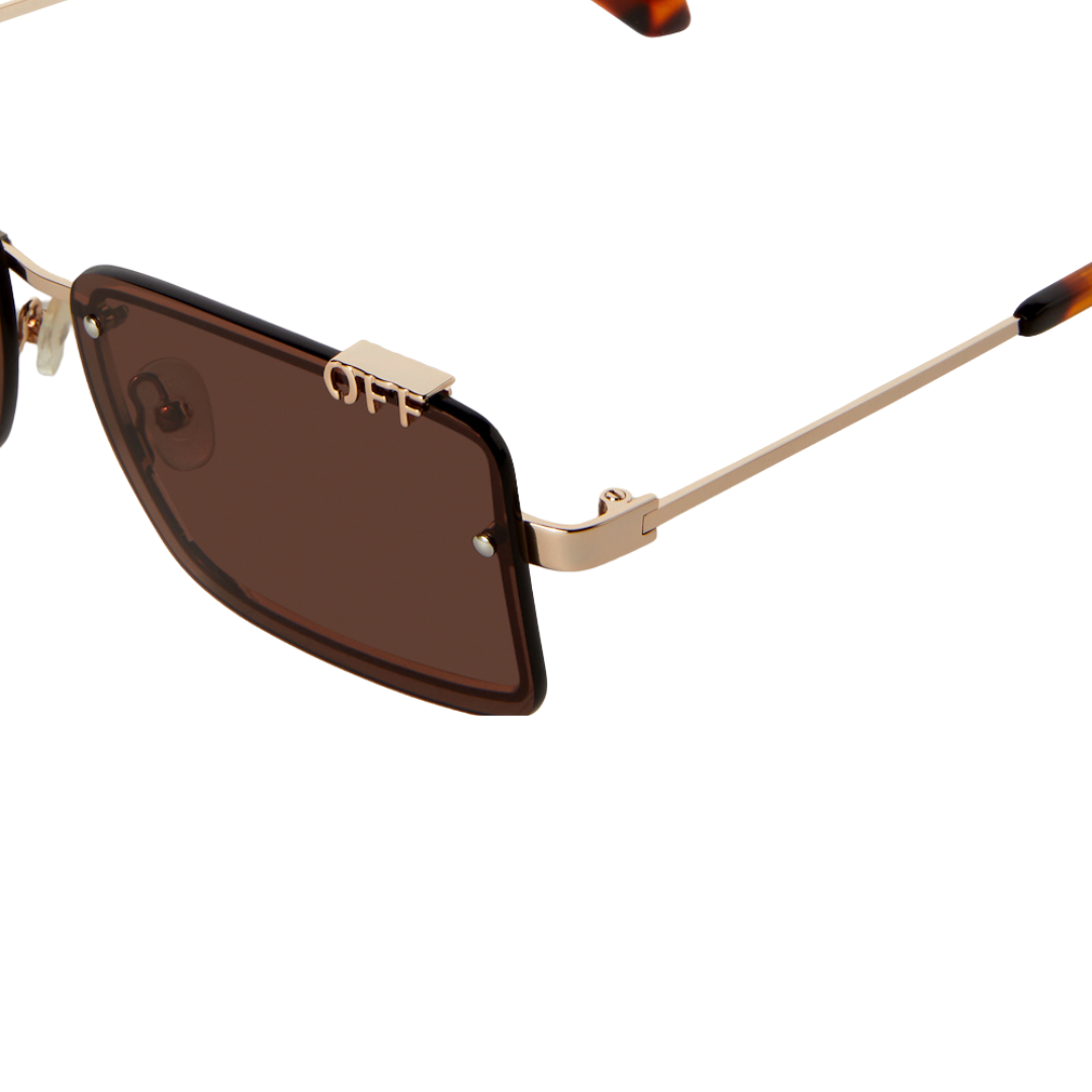La montatura rimless, con la sua forma rettangolare e la struttura esile in metallo, è accompagnata da naselli in silicone e terminali delle aste in acetato per un tocco di comfort. L’accessorio realizzato in Italia è completato da una placca con logo OFF sul frontale