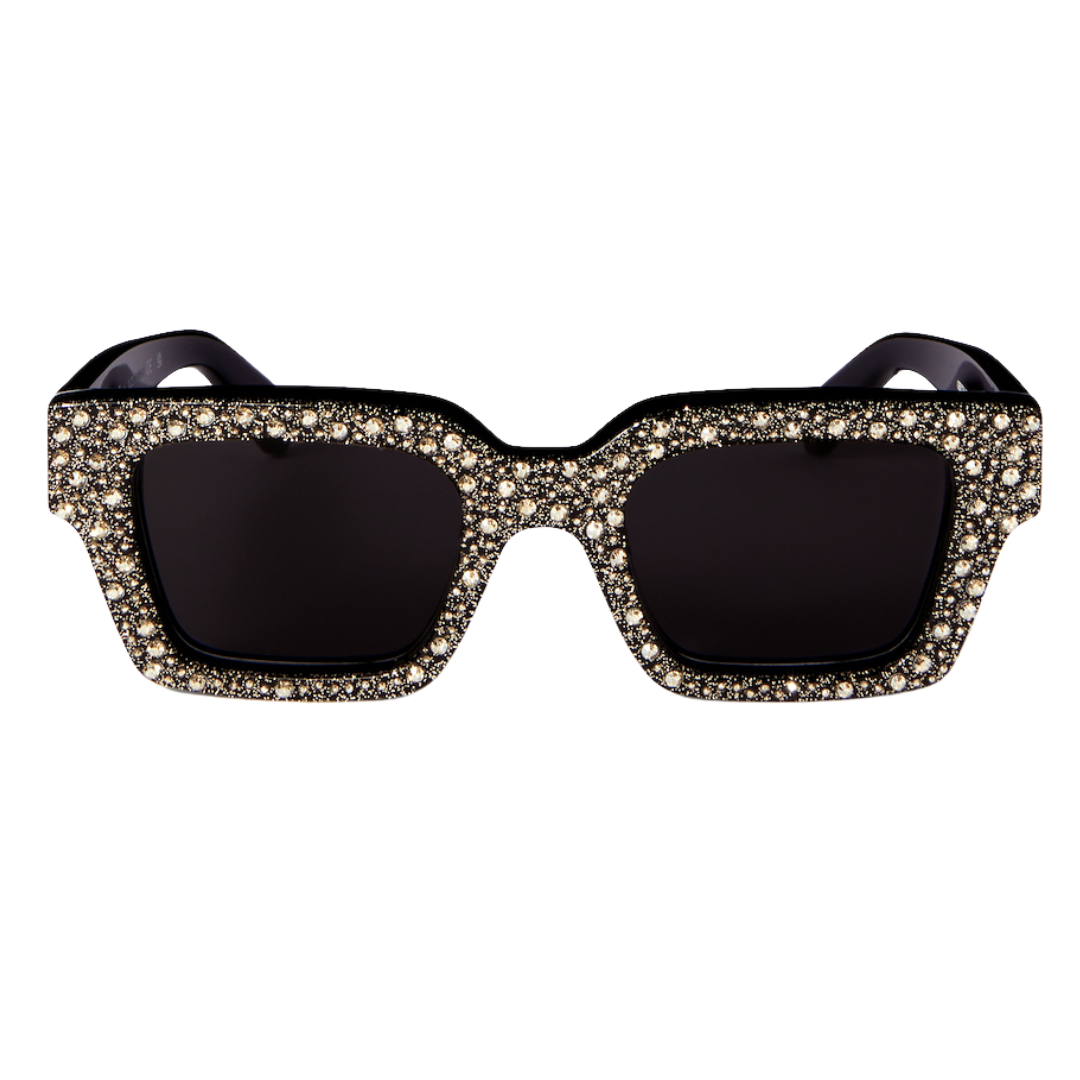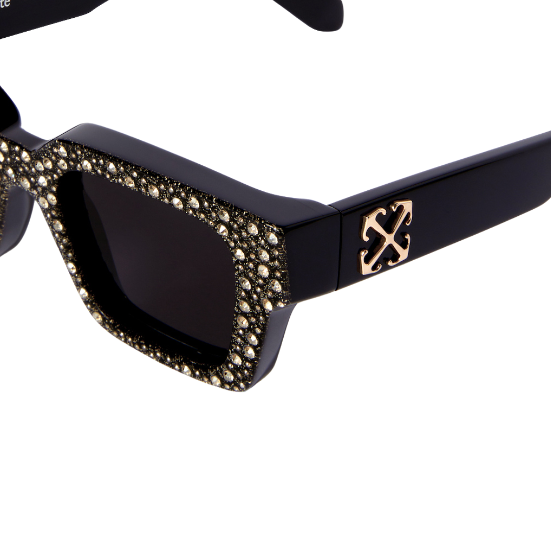 Occhiale Off White in acetato nero ricoperto di strass sul frontale con logo sulle aste in oro.