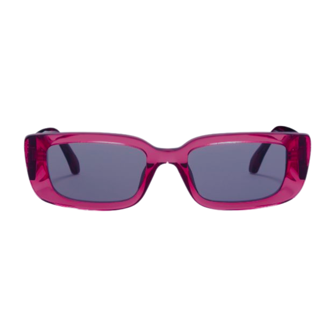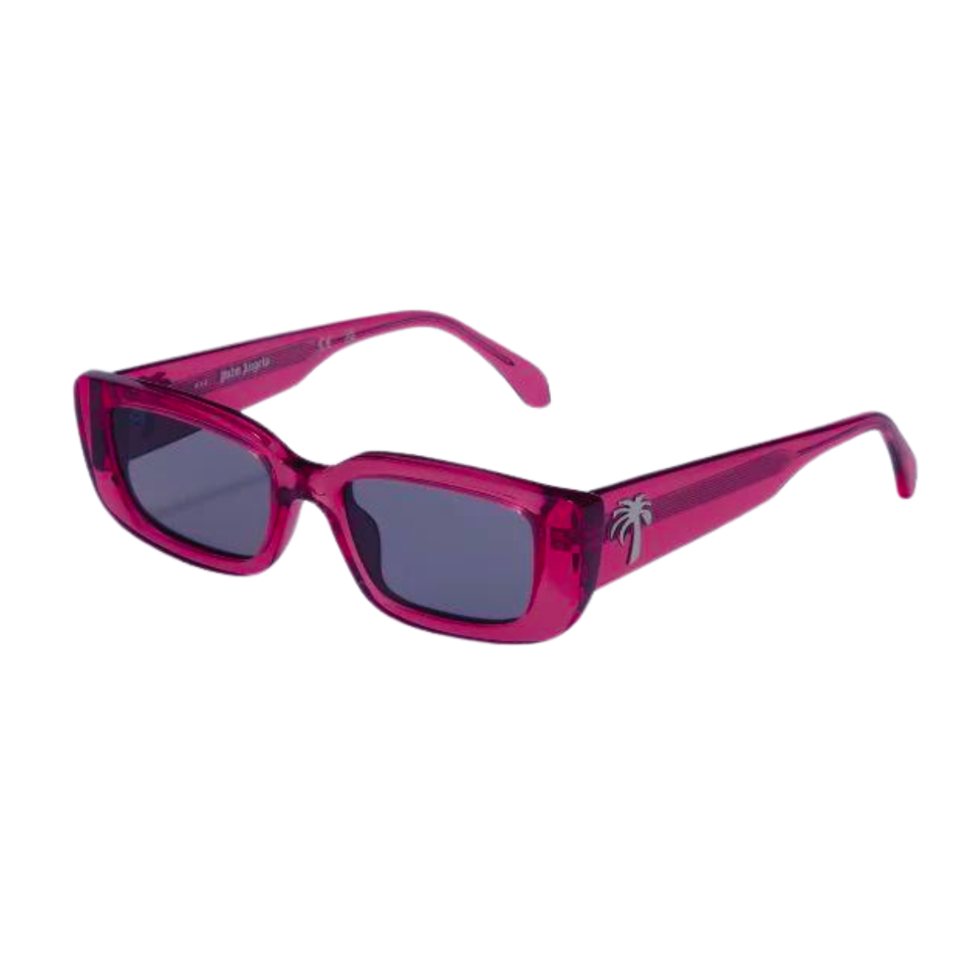 Occhiali da sole in acetato rubino trasparente dalla montatura rettangolare con profili leggermente allungati, lenti nere e alte aste decorate con piastrina argentata a forma di palma.