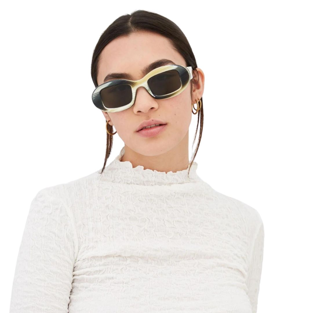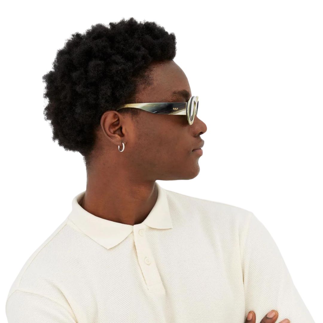 Geometrie contrastanti e design elegante caratterizzano questa icona moderna: “Tutto” รจ un’ampia forma orizzontale caratterizzata da cerchi a zecca e sinuosi che racchiudono lenti squadrate. Concepito come una silhouette giocosa ma ultra elegante, “Tutto” abbraccia il glamour senza tempo delle forme femminili del 1960 con un tocco unisex contemporaneo sgangherato. Questa versione di Tutto presenta un vivace e unico acetato simile al corno con lenti nere.