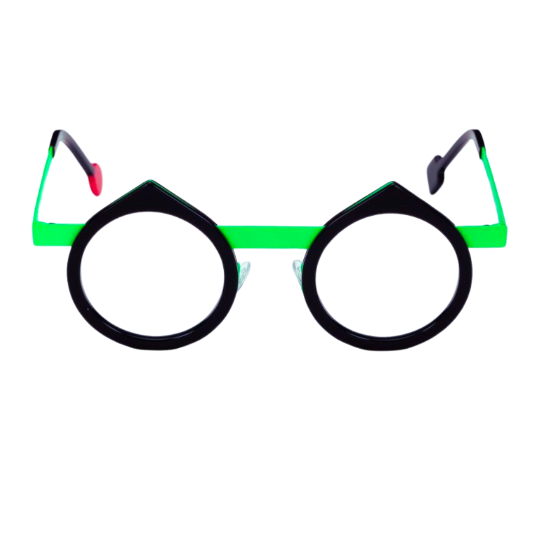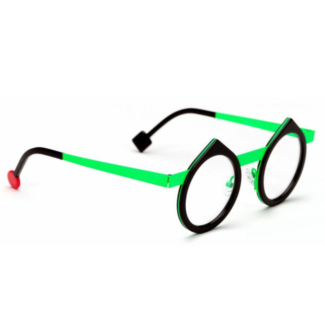-15%Occhiale Sabine Be in metallo verde fluorescente e acetato nero, particolare forma a goccia e lenti trasparenti