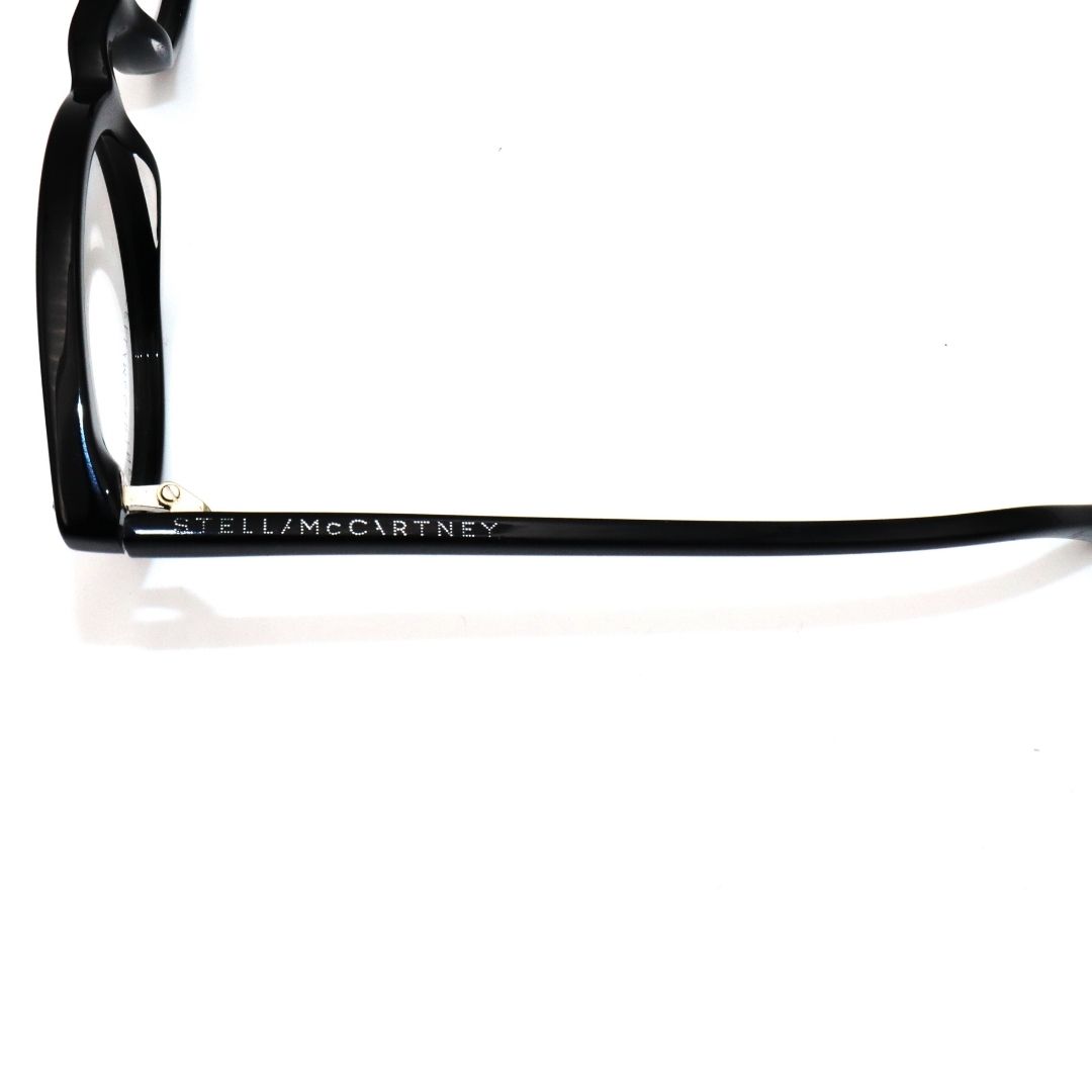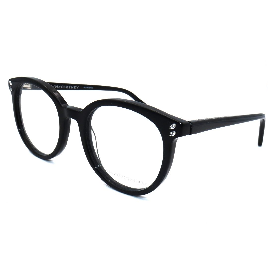 Montatura occhiale da vista Stella McCartney per donna, questa montatura si presenta con una forma tonda in acetato nero lucido con dei punti luce sul frontale, elegante e femminile, adatta ad ogni occasione.
